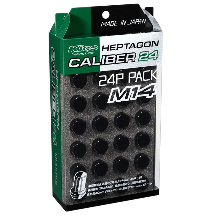 The Project Kics Heptagon Caliber 24 Lug Nuts offer a unique heptagon, 7-sided shape for added security, deterring theft by requiring a special socket not found in standard tool kits. Available in M12 or M14 thread sizes, they use a 60-degree tapered seat. Each package includes a specially designed Heptagon adapter for easy installation with a 19/21Hex socket.